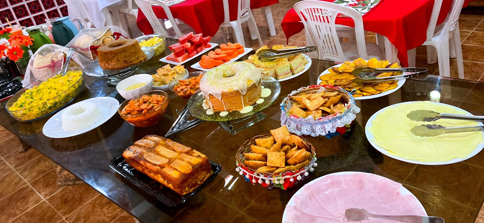 Café da manhá completo, com variedade de massas, sucos e frutas. Servido em formato de buffet.